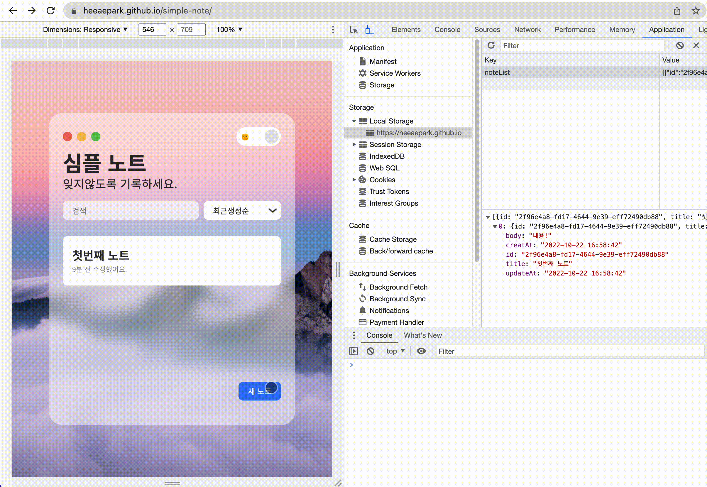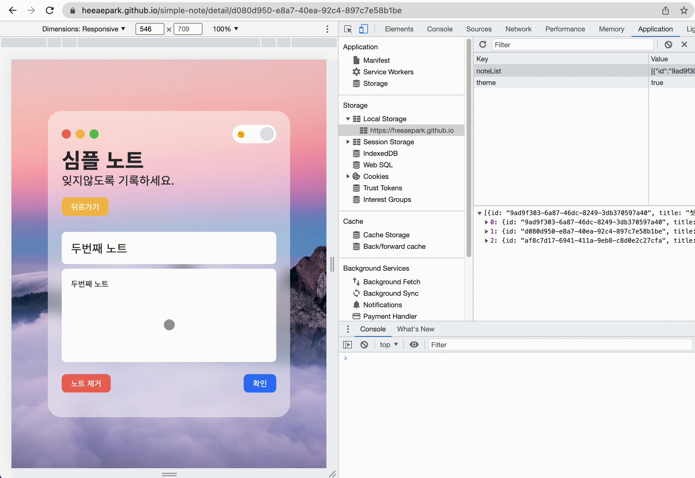 노트를 작성 후 확인 버튼 클릭 시, JSON.stringify()를 이용하여 노트 정보를 객체에서 문자열로 변환 한 뒤 localStorage.setItem()을 이용해 로컬스토리지 저장소에 노트 정보를 배열로 저장합니다.